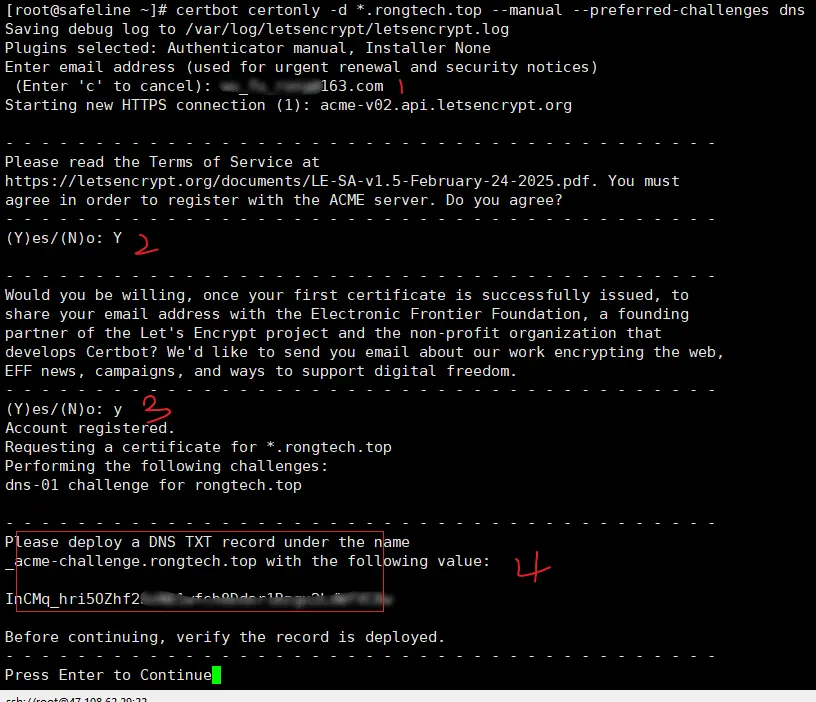 yum install certbot -y2、在linux服务器上申请证书,使用泛域名*.rongtech.top
