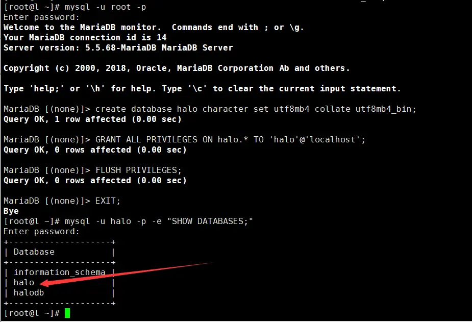 mysql -u halo -p -e "SHOW DATABASES;"输出应包含你创建的数据库 `halo。