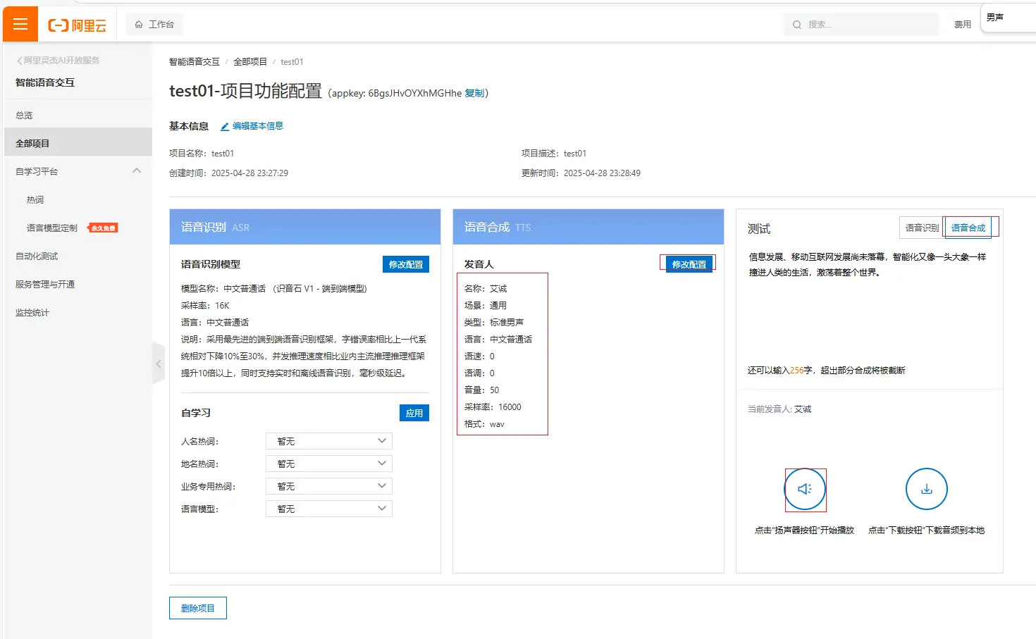 #appkey是在语音服务控制台中创建的项目key 也要替换成你自己的
