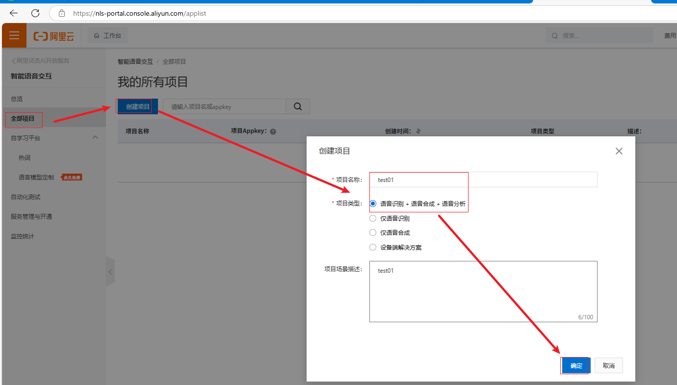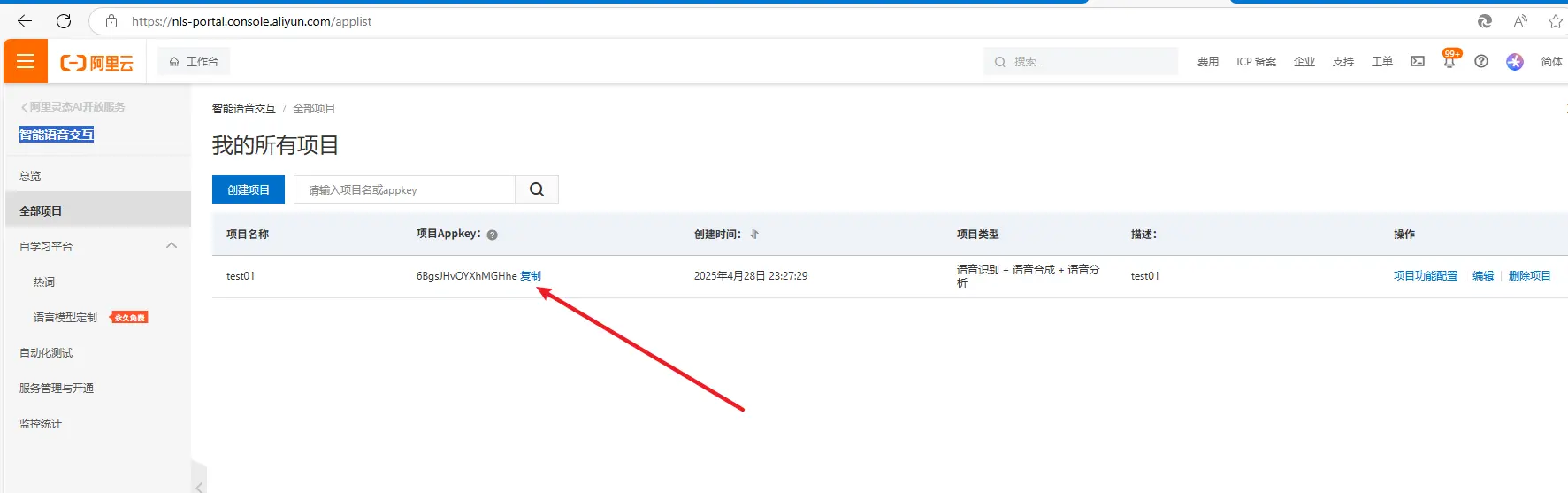 5、打开语音服务控制台,创建项目。记录下项目Key