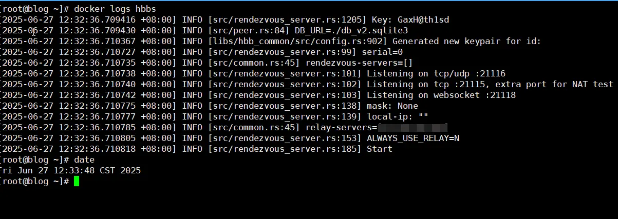 sudo docker run --privileged -v /etc/localtime:/etc/localtime:ro --name hbbr -v /root/rustdeskdata:/root -td --net=host --restart unless-stopped rustdesk/rustdesk-server hbbr查看日志,时间已经一致。