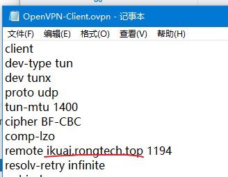 5、导出之后把文件后缀名修改成ovpn保存后再编辑将服务器ipv4地址改成ipv6地址保存后导入连接工具