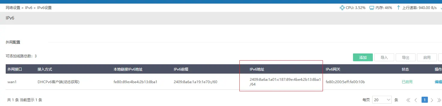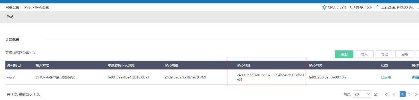 网络设置> IPv6 > IPv6设置,查看IPV6的连接IP地址,