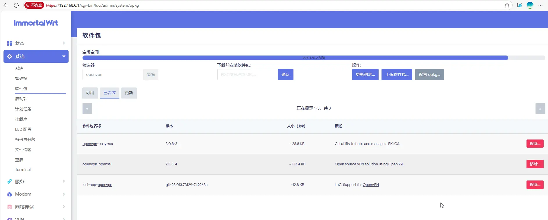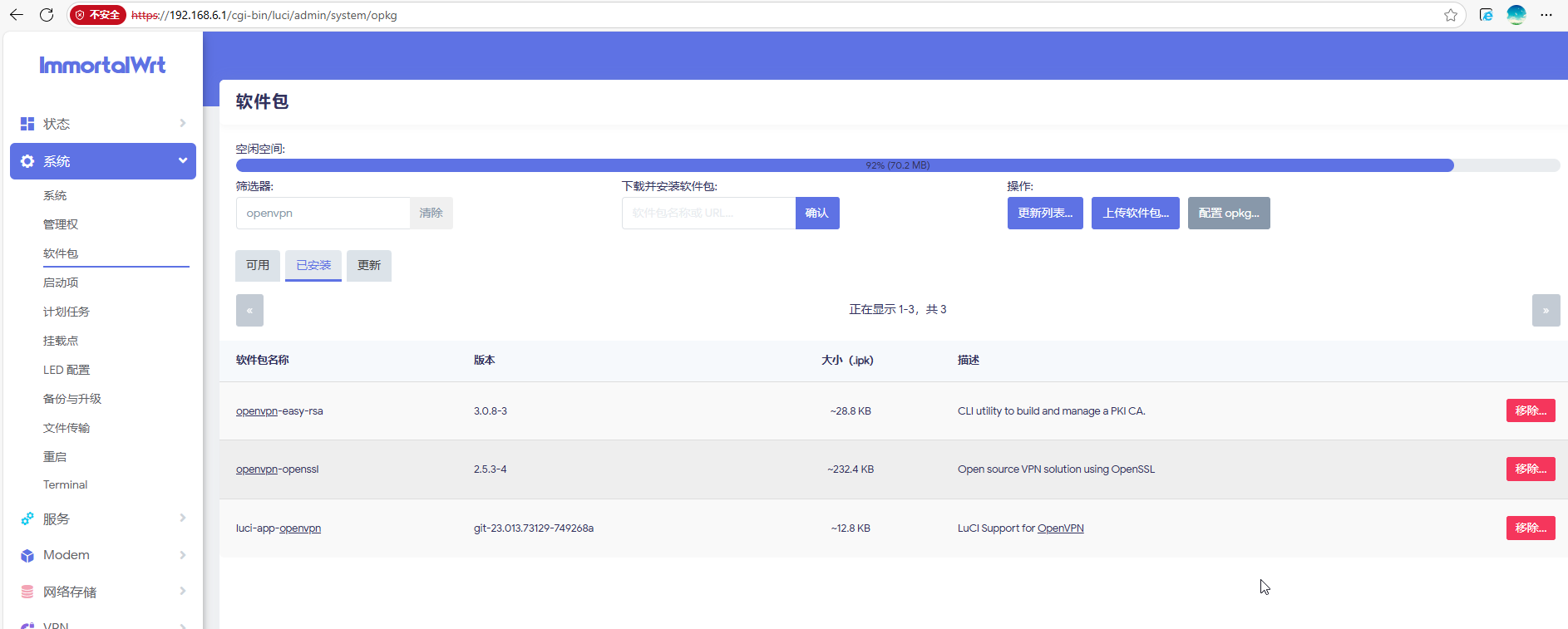 1.安装openvpn,安装好如下所示3个包,安装后重启一下路由器