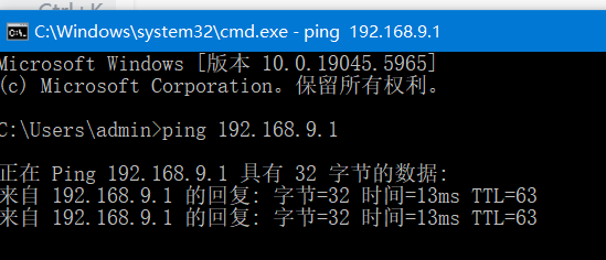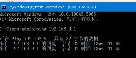 使用连接openwrt路由器的终端直接ping 爱快路由器网关192.168.9.1,验证连通成功。