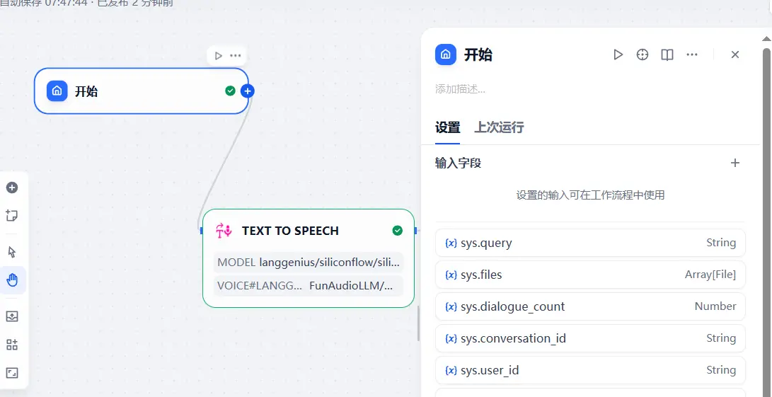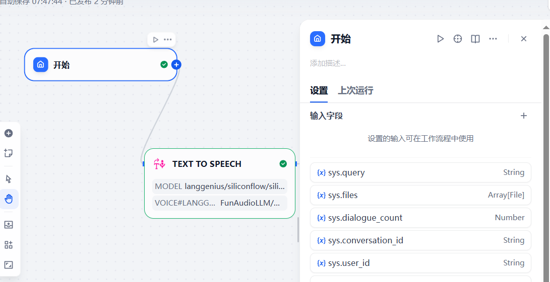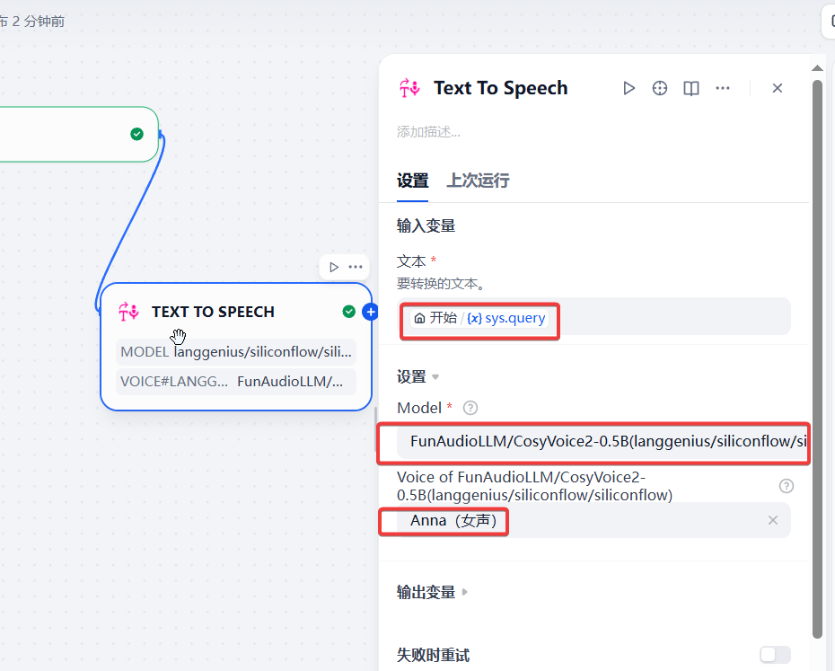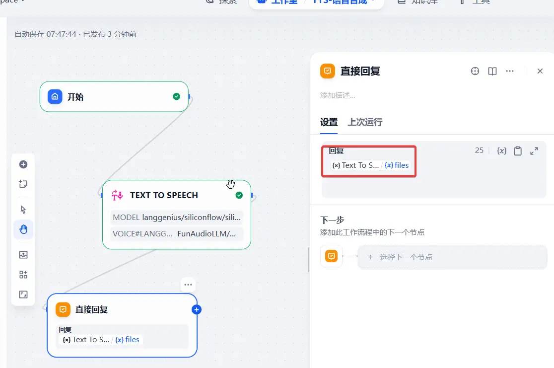 6、在应用中添加 文本转语音 插件,配置如下: