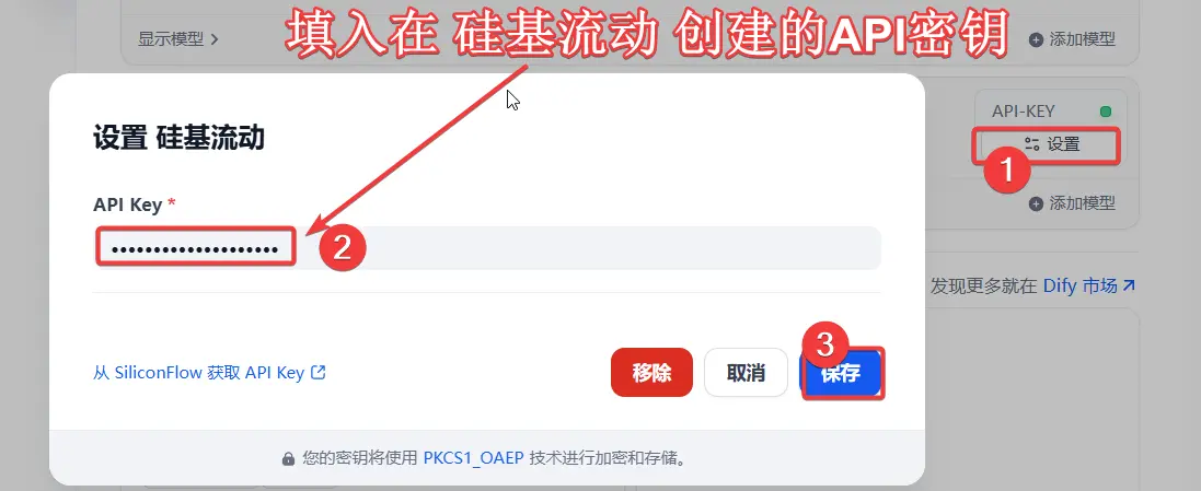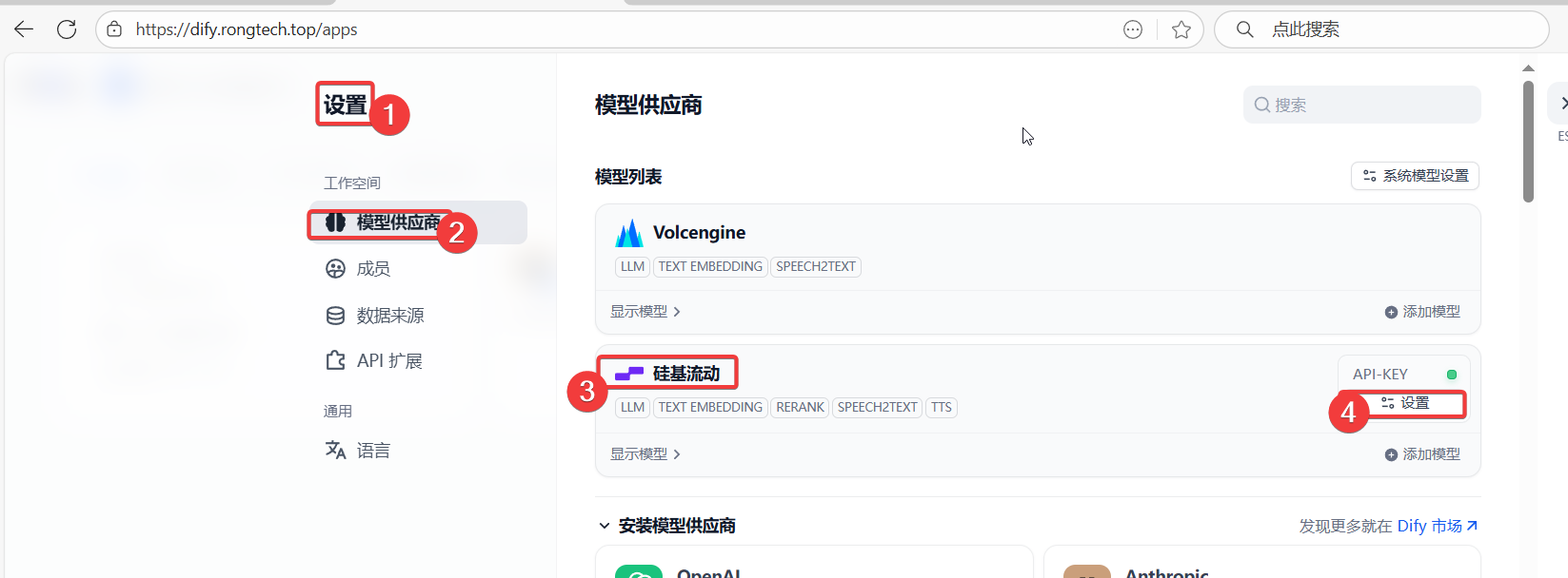 先安装 模型供应商:硅基流动,然后按下图所示步骤设置模型API key