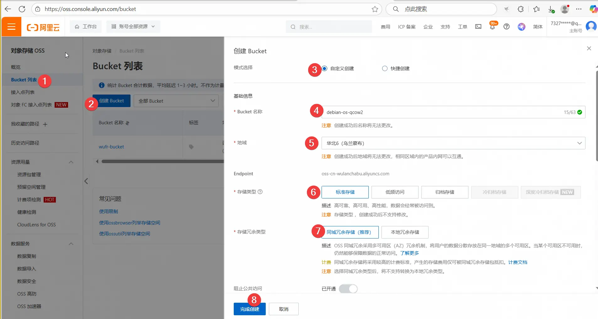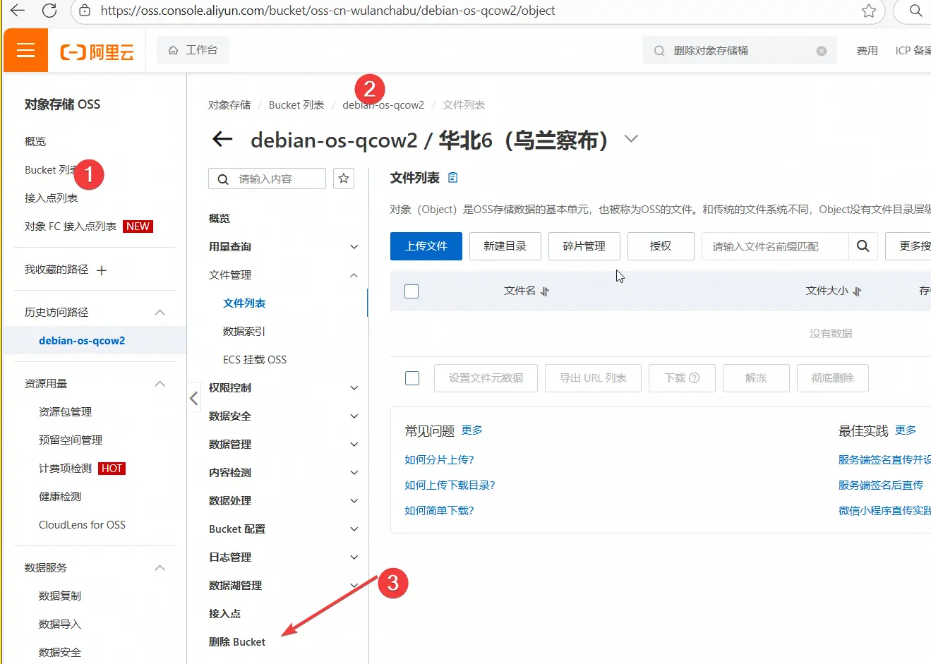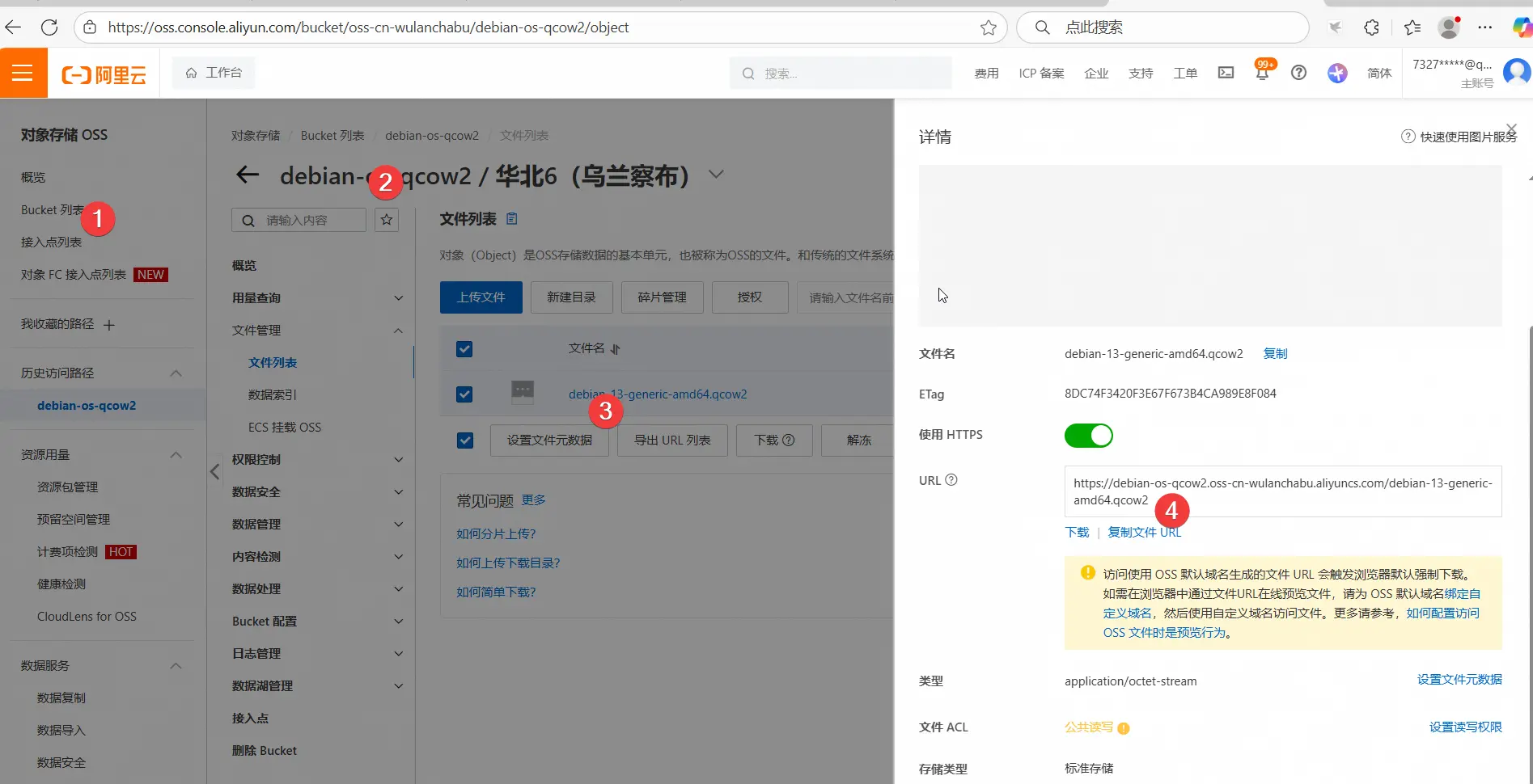 打开阿里云对象存储控制台,创建桶,将debian qcow2镜像上传到桶里面。