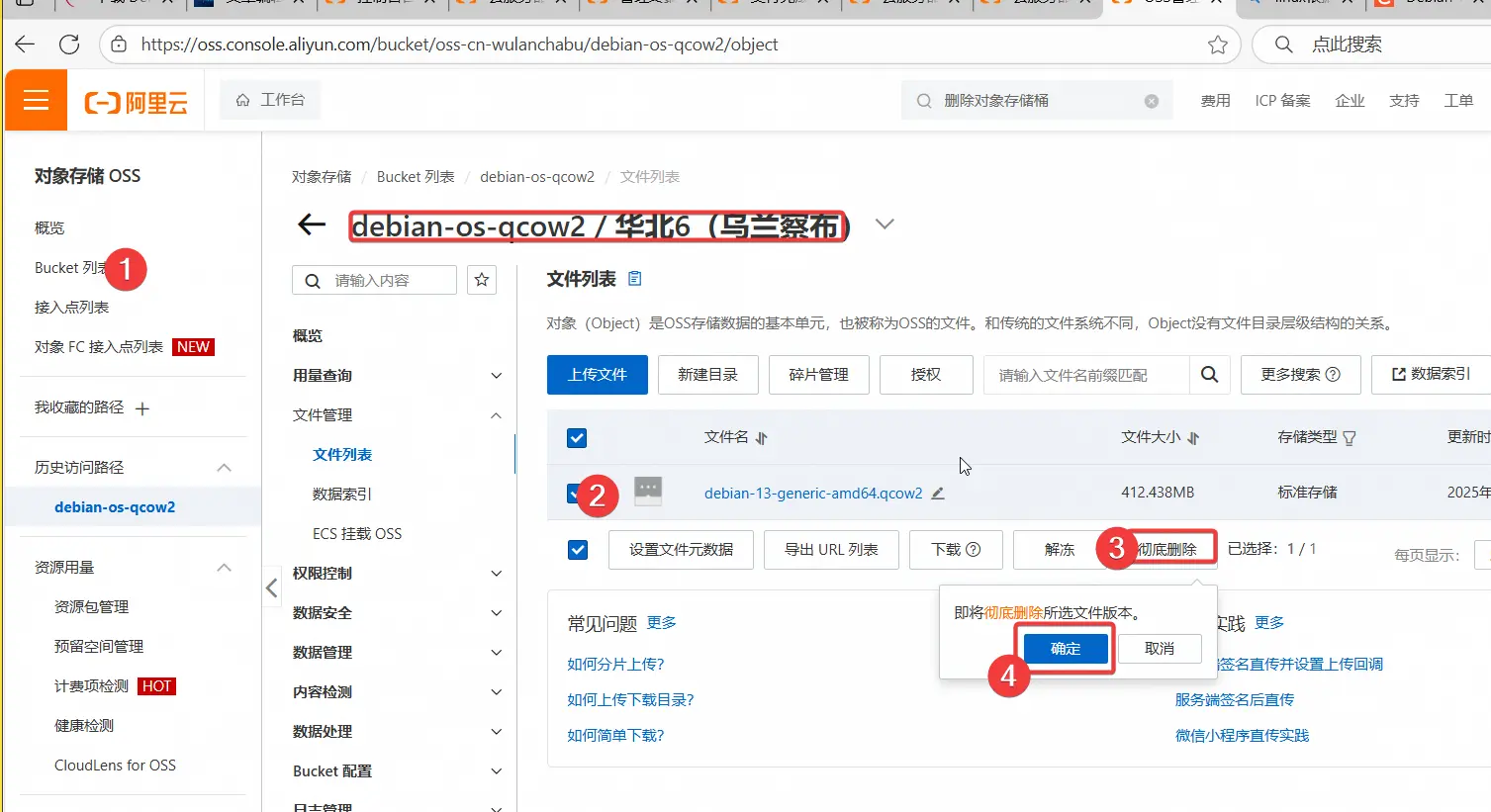 镜像可以直接删除。对象存储先删除桶里面的文件,再删除桶。