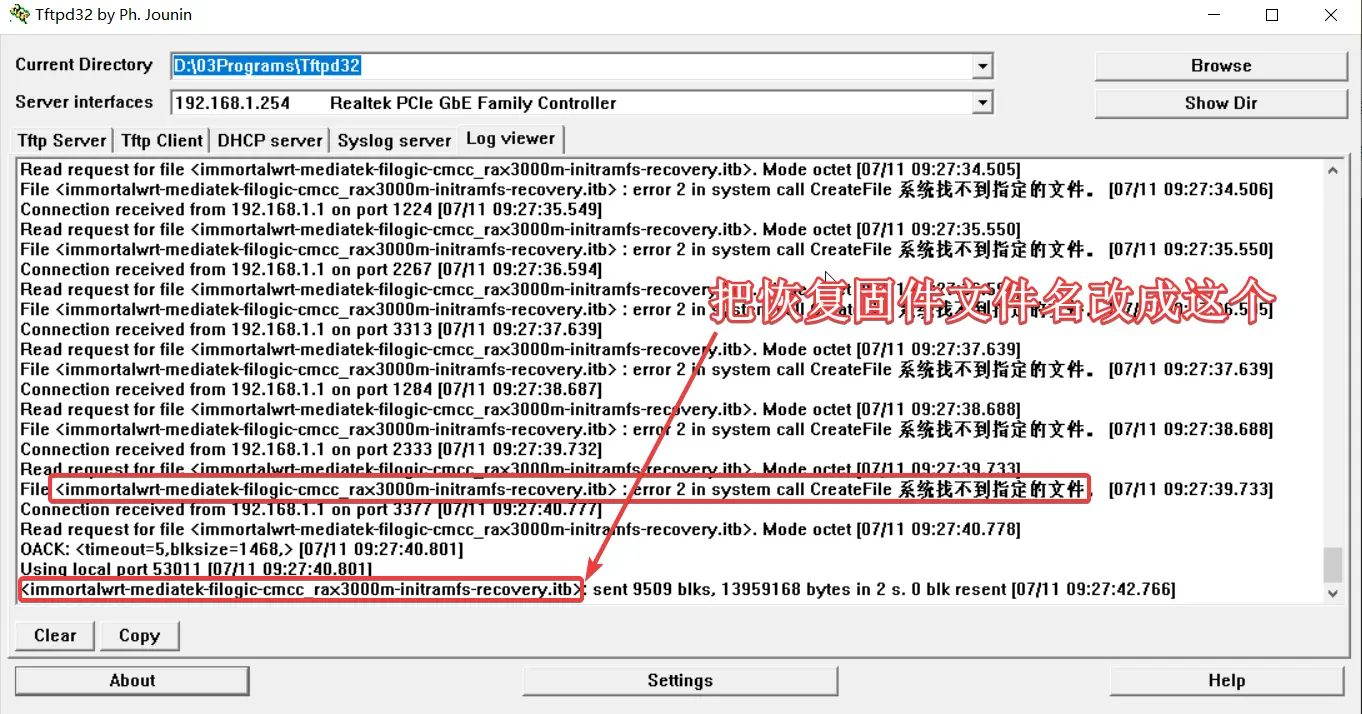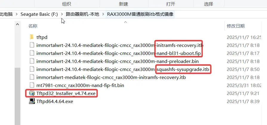 安装并打开tftpd32软件。将immortalwrt-24.10.4-mediatek-filogic-cmcc_rax3000m-initramfs-recovery.itb文件名重命名为immortalwrt-mediatek-filogic-cmcc_rax3000m-initramfs-recovery.itb放入到tftpd32安装目录的根目录,等待固件自动上传到路由器,上传完成会自动刷入这个固件。