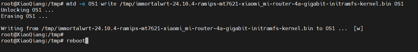 mtd -e OS1 write /tmp/immortalwrt-24.10.4-ramips-mt7621-xiaomi_mi-router-4a-gigabit-initramfs-kernel.bin OS1