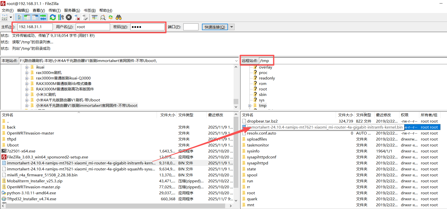 先刷initramfs-固件,使用FTP工具上传initramfs固件到/tmp