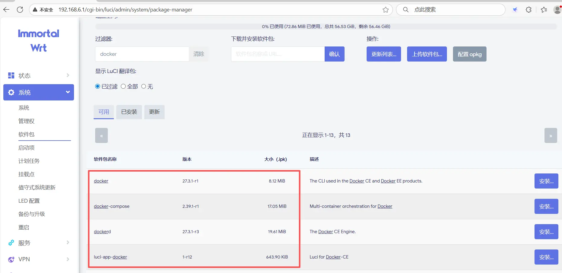 opkg install docker-compose dockerd docker luci-app-docker luci-i18n-docker-zh-cn