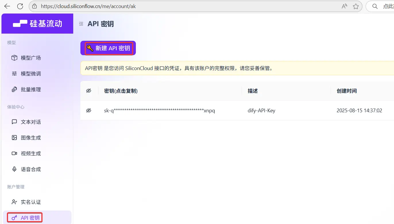 硅基流动创建API密钥,将API密钥保存备用,不要泄露