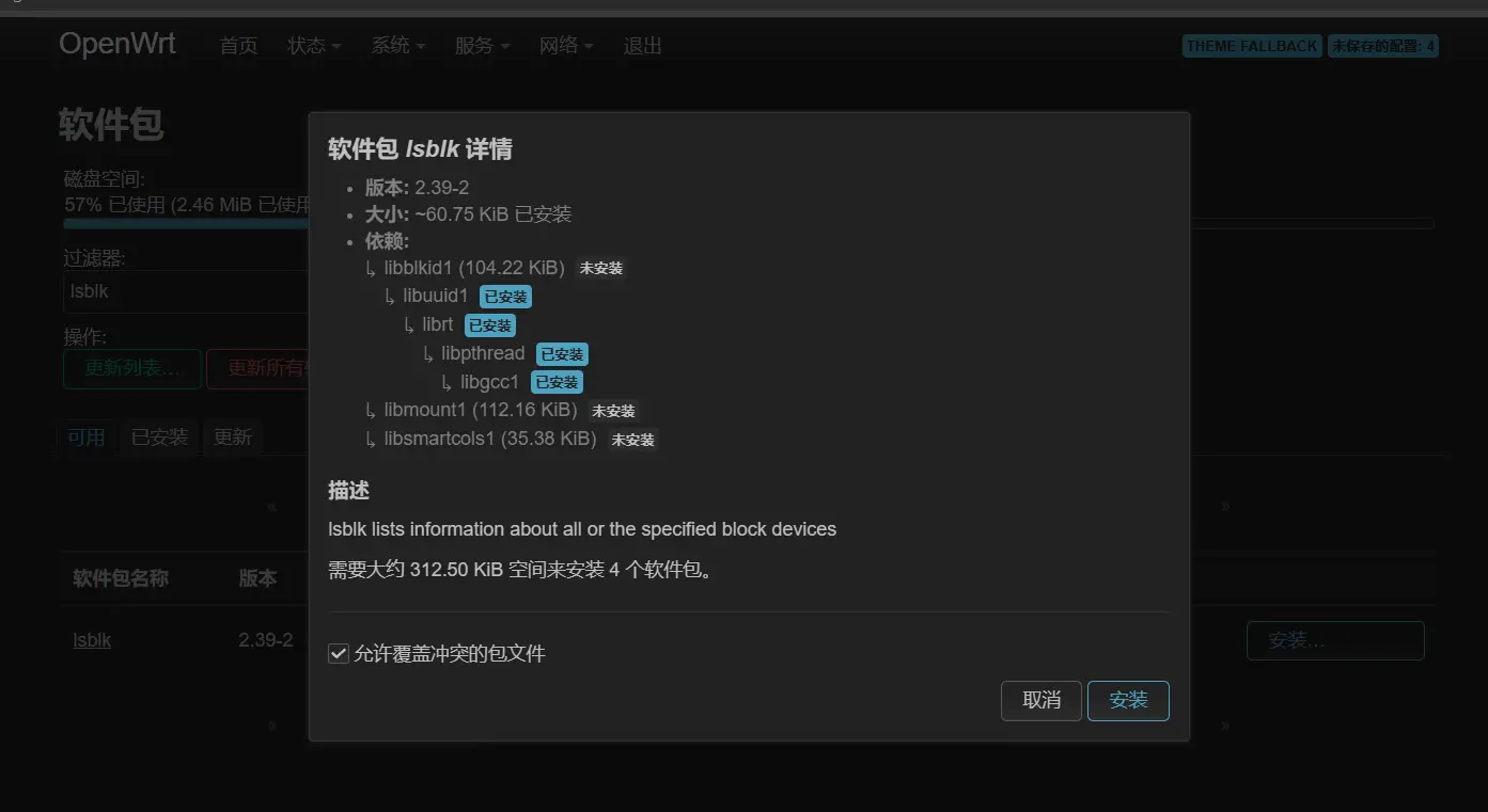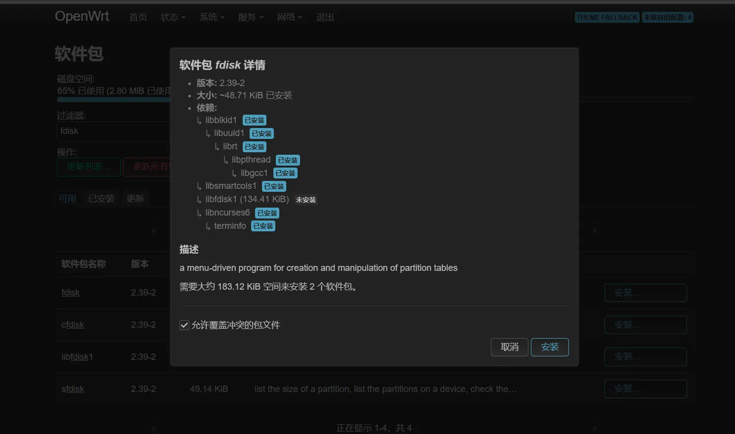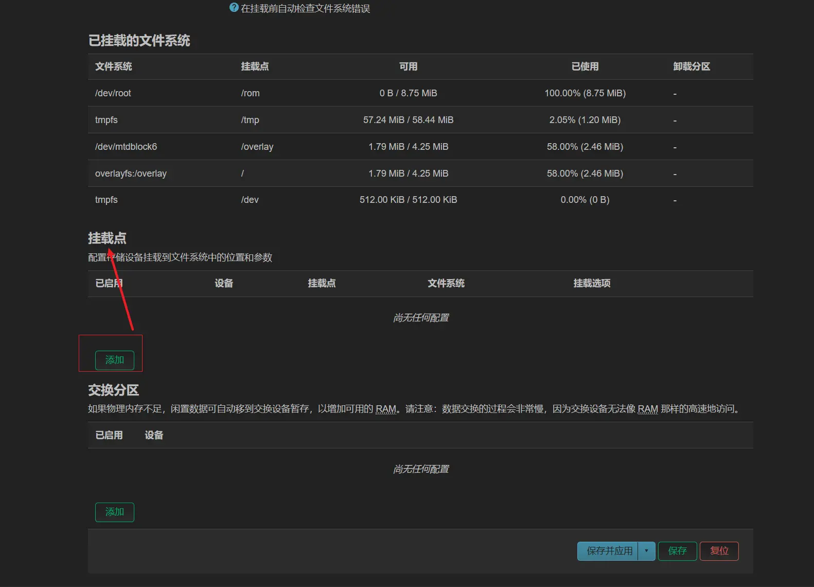 4、找到空闲的磁盘,先别点保存,将命令复制到bash终端中执行完后,再回来点保存应用,最后重启路由器。
