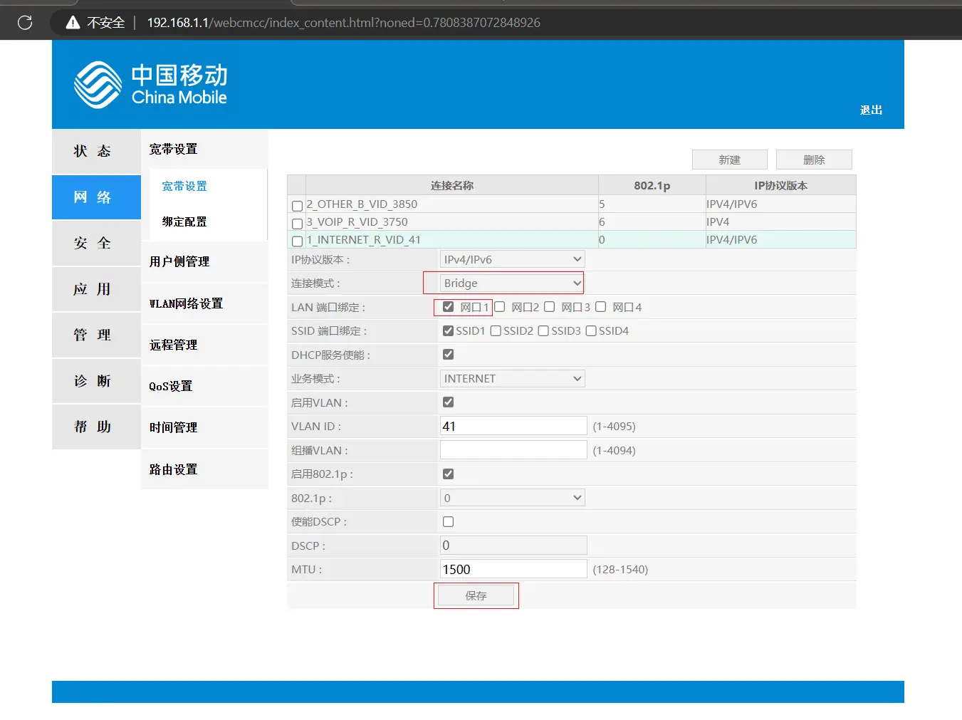 3、修改连接配置,连接模式改成桥接,勾选网口1(用来连接路由器拨号),保存