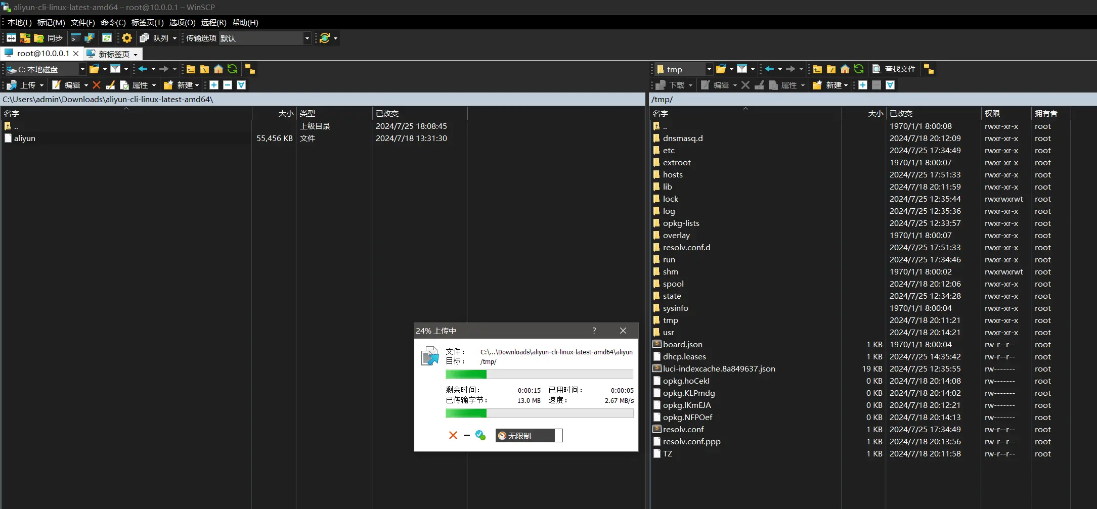 2、将aliyun cli上传到openwrt 的/tmp目录下。文件大小54MiB,我这里只有/tmp目录有空间存放.