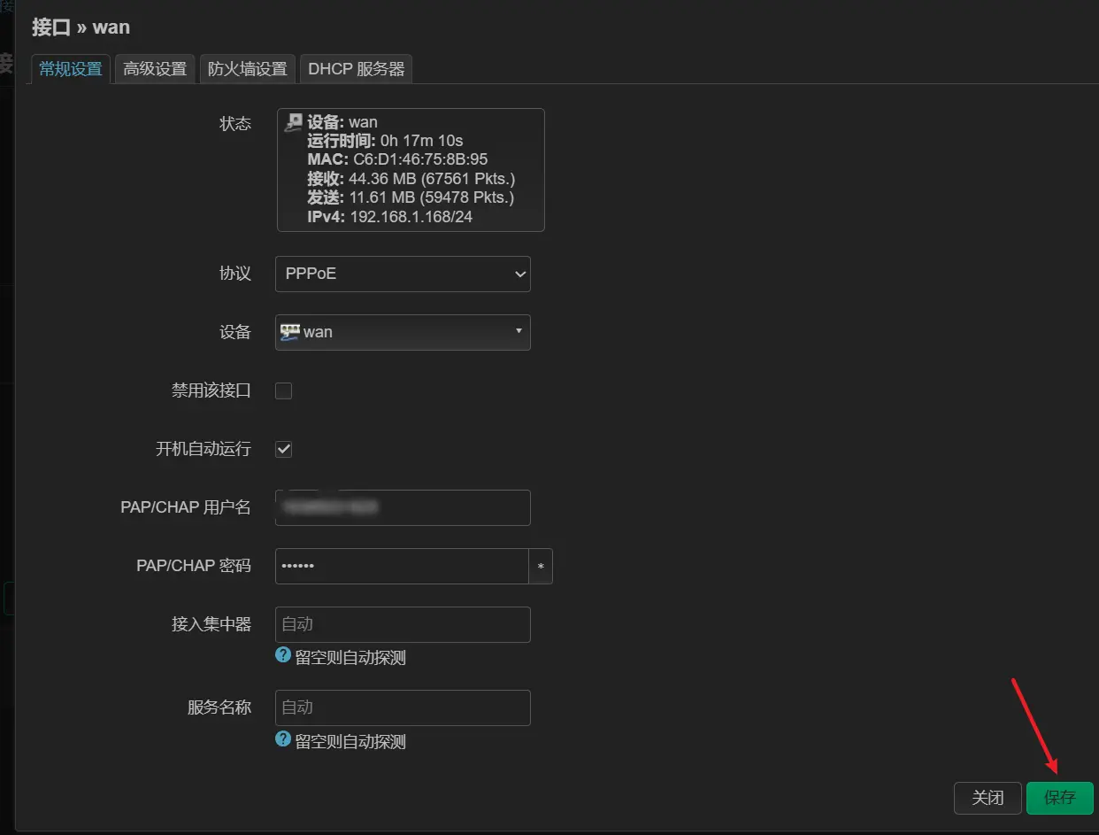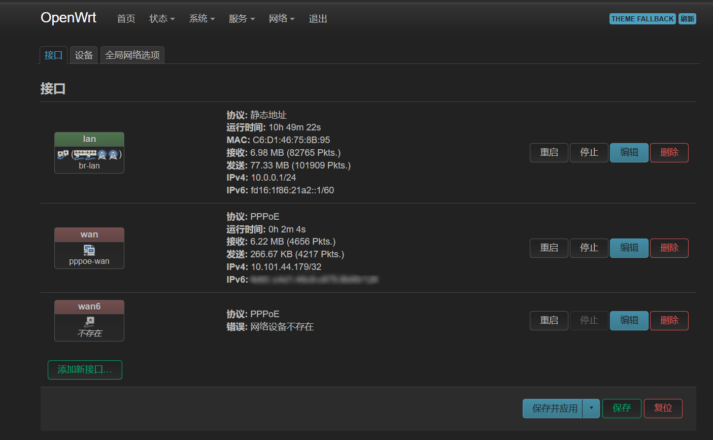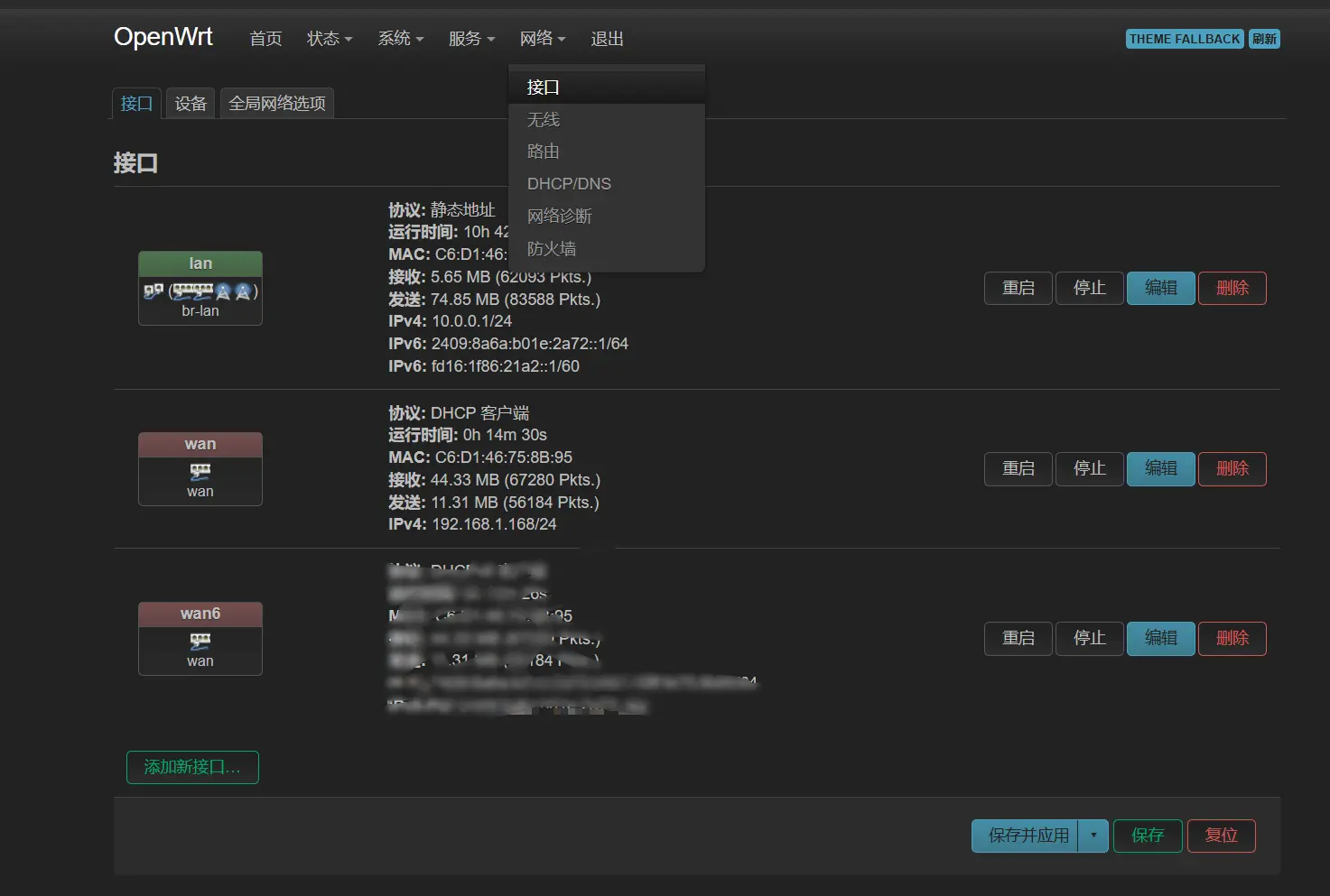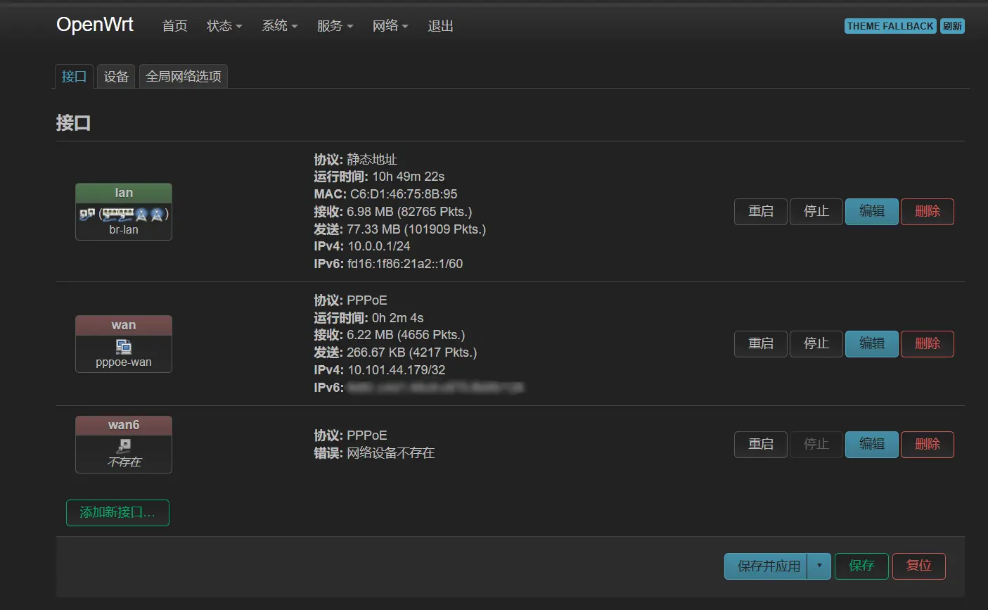 4、配置完成后,如果不成功,可以重启一起光猫和路由器。最后成功拨号获取到ip。wan6口可以忽略