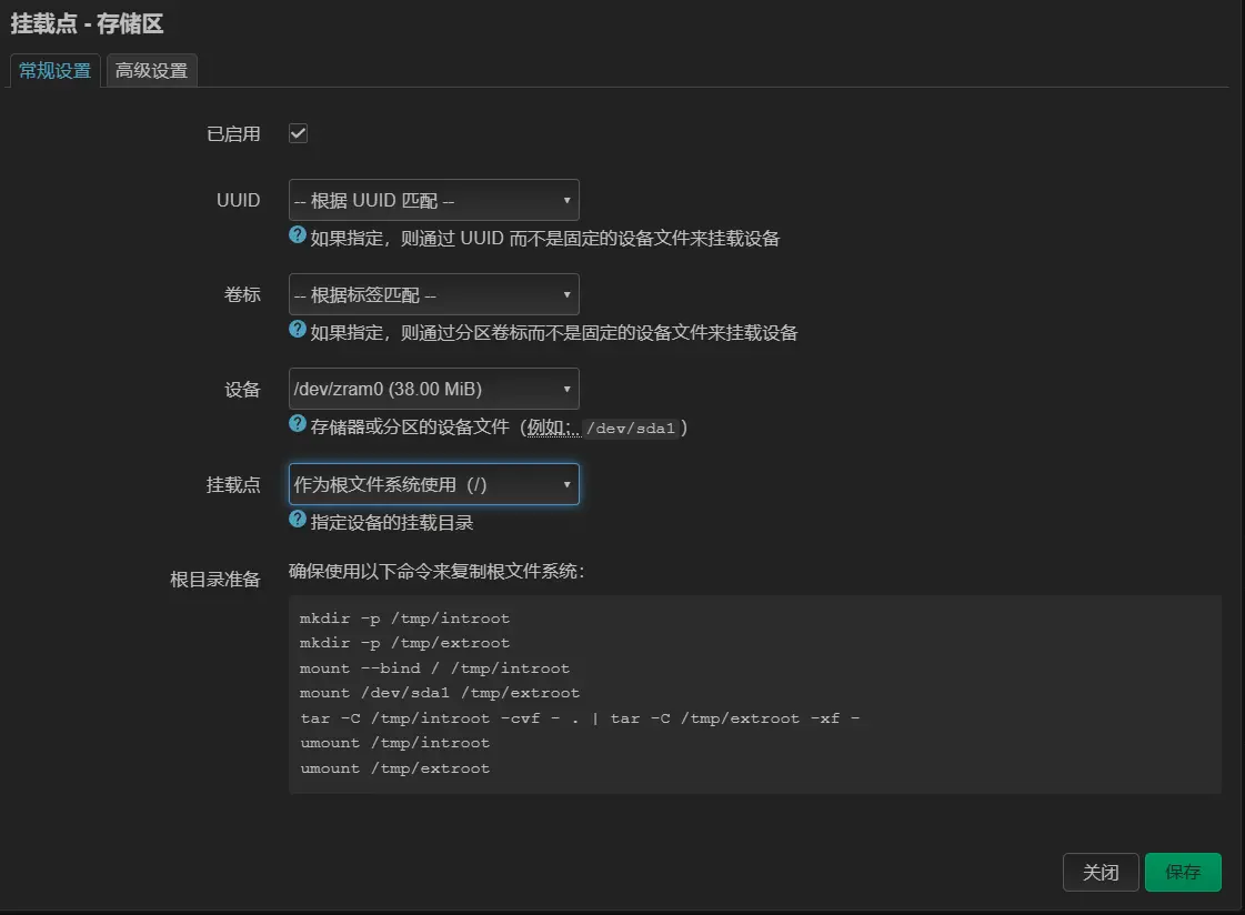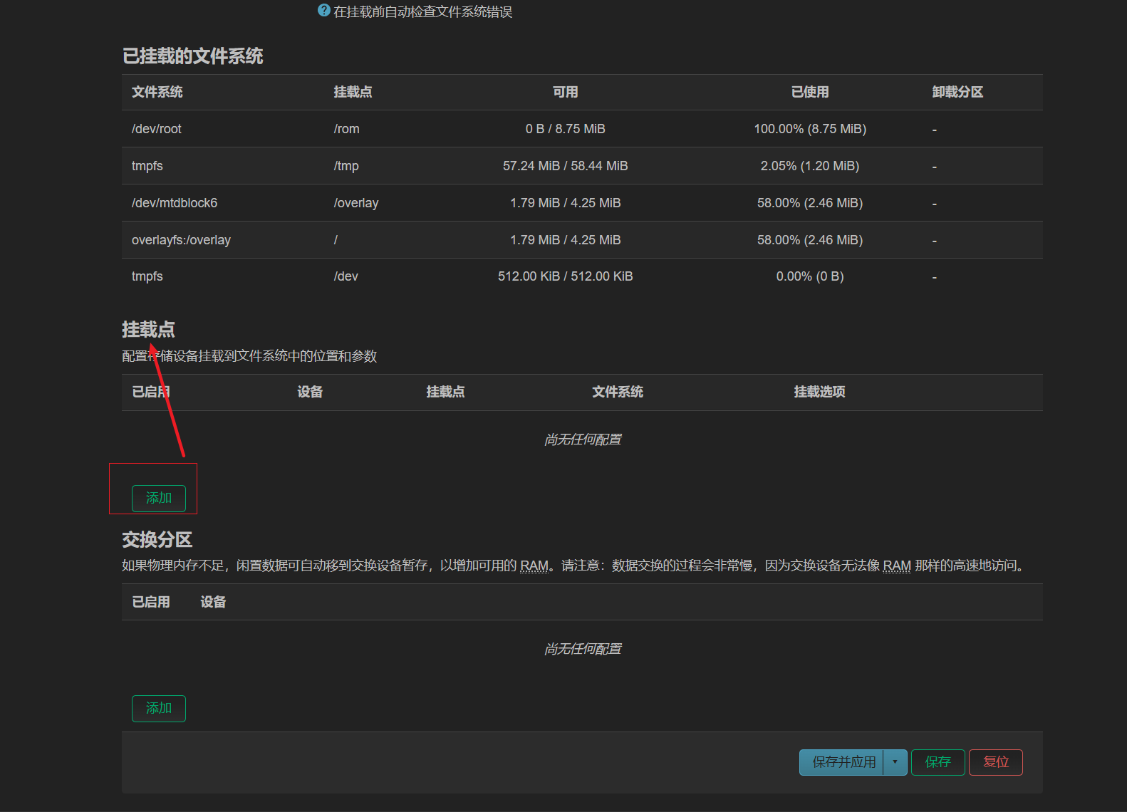 3、系统-挂载点,先设置一下全局挂载点设置,我这里交换空间那个磁盘比较大,取消使用交换分区。保存设置,重启路由器。