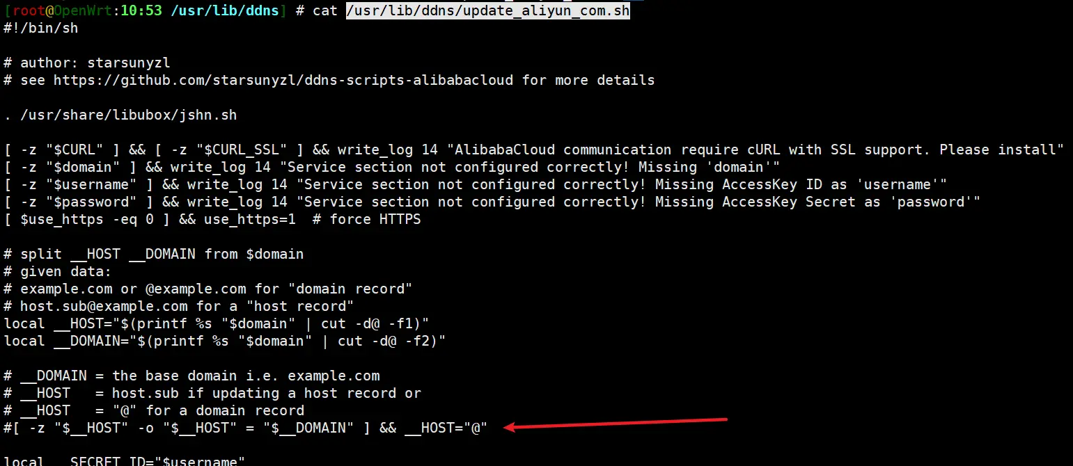 7、重点:使用时发现ddns不生效,修改脚本/usr/lib/ddns/update_aliyun_com.sh内容,注释掉# [ -z "$HOST" -o "$HOST" = "$DOMAIN" ] && HOST="@"