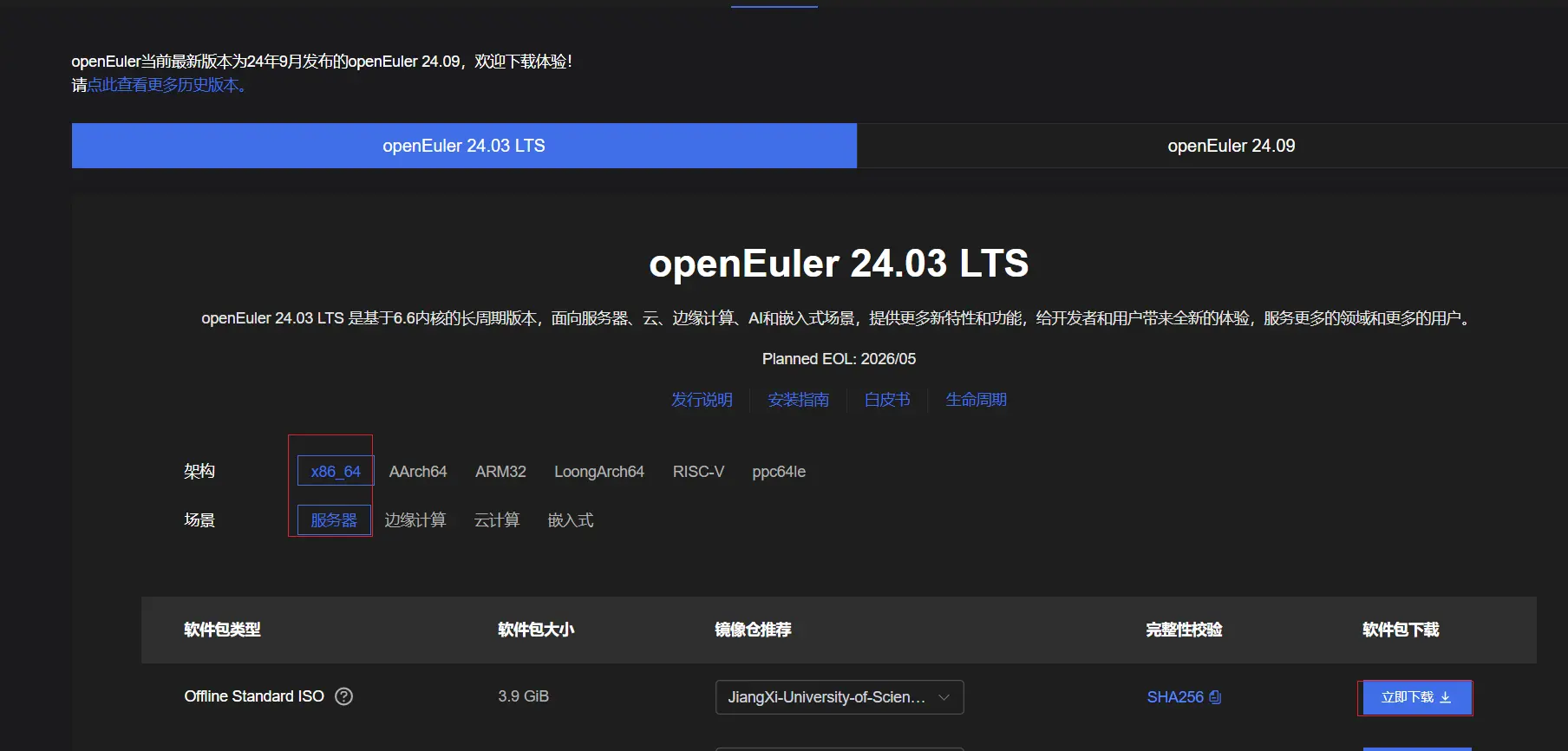 https://www.openeuler.org/zh/download/?version=openEuler%2024.03%20LTS