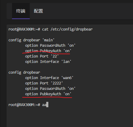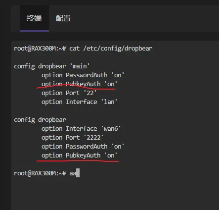 #/etc/config/dropbear文件中主要添加option PubkeyAuth 'on' # 启用密钥认证 ,待测试秘钥认证可以正常登录以后,关闭密码认证登录vi /etc/config/dropbear