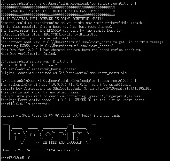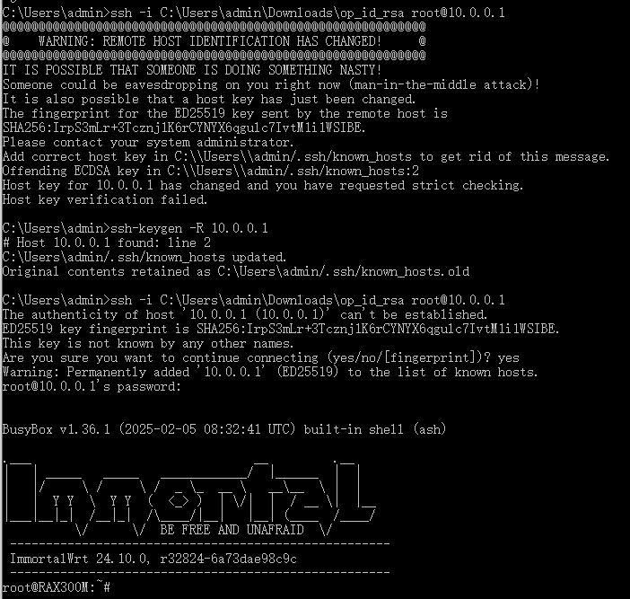 #由于之前我ssh连接过这台路由器,执行以下命令删除与 10.0.0.1 相关的旧密钥: